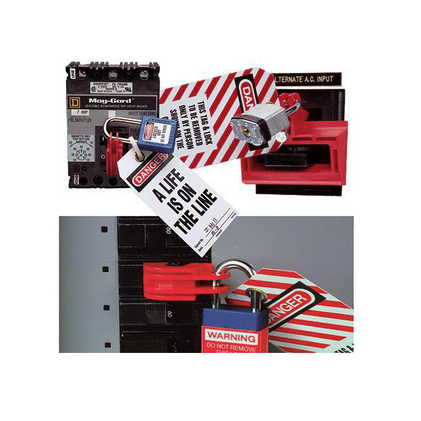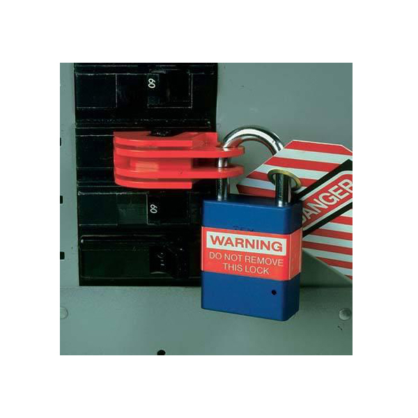 Individual circuit breakers can be locked in the off position quickly and easily. Compact, universal design fits a wide range of single, double and triple handle circuit breakers. Accommodates breaker handles 0.30 to 0.6 inches tall and 0.25 to 0.44 inches thick. Easily attached with no modifications to panel or circuit breaker and does not require hole in circuit breaker handle. Constructed of rugged nylon and stainless steel, providing strength, durability, added security and corrosion resistance.